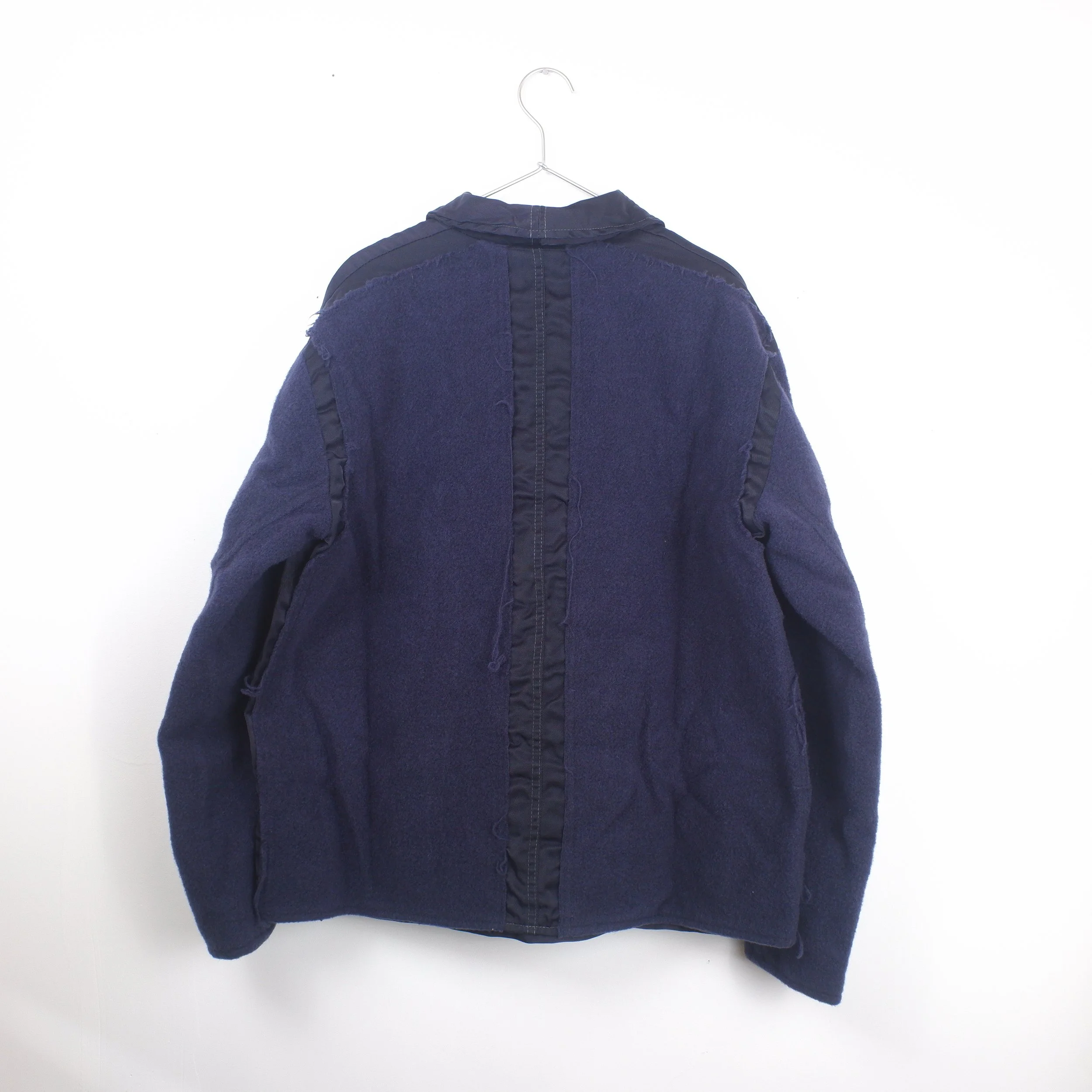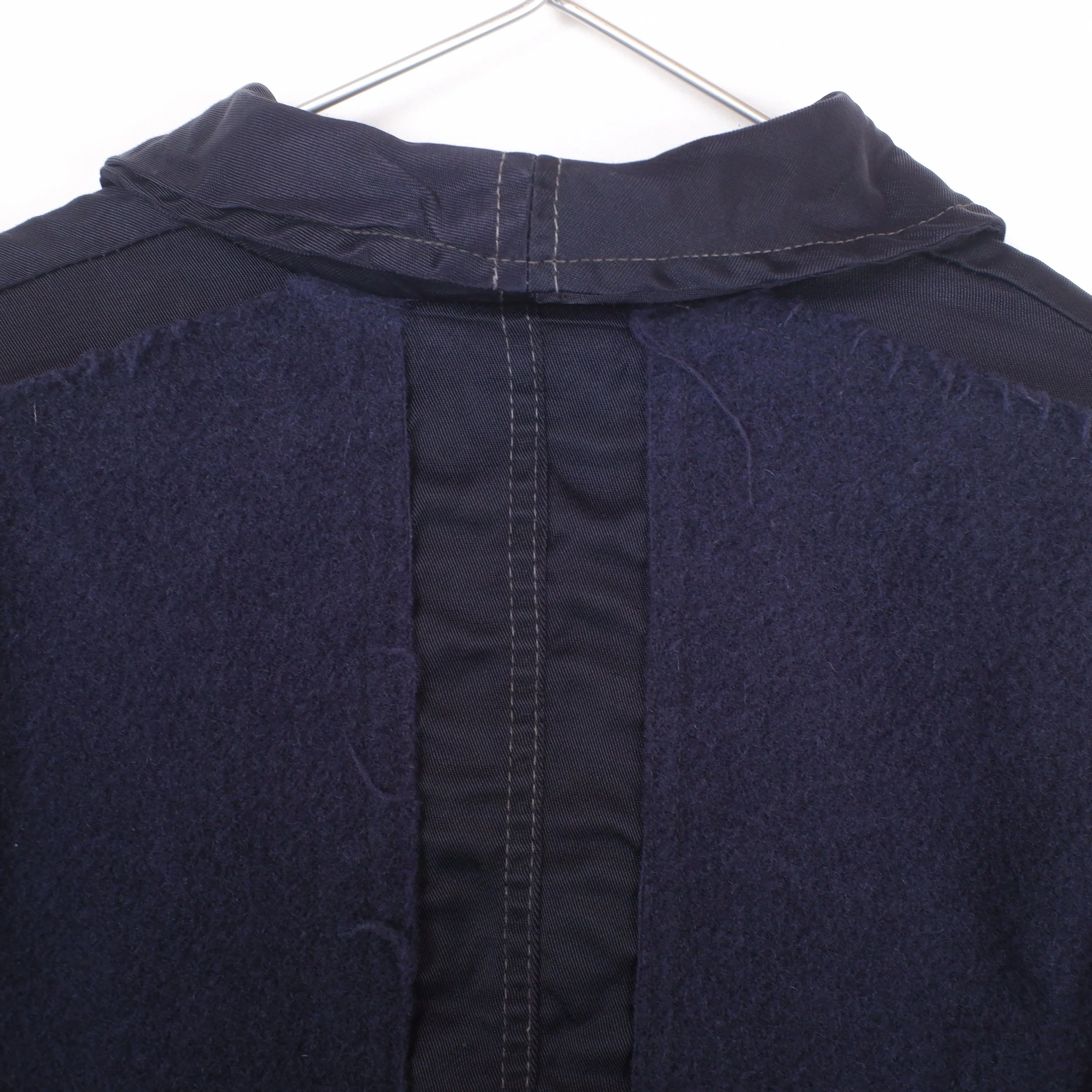 The applied panels create the warmth of three layers in the coat without adding bulk to the seams. The wool panels edges are left raw and fray out over the nylon panels, showing the construction and fabric textures.