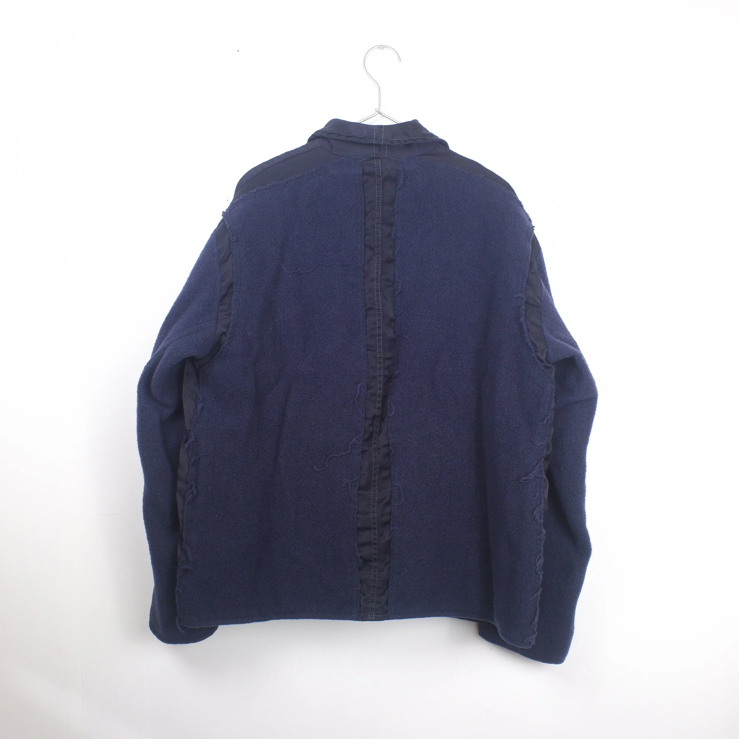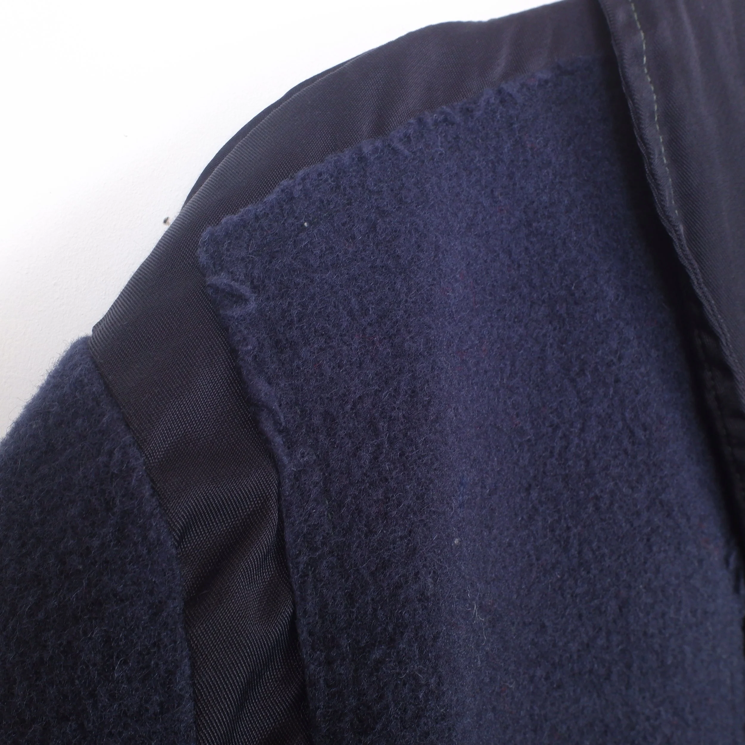 The applied panels create the warmth of three layers in the coat without adding bulk to the seams. The wool panels edges are left raw and fray out over the nylon panels, showing the construction and fabric textures.