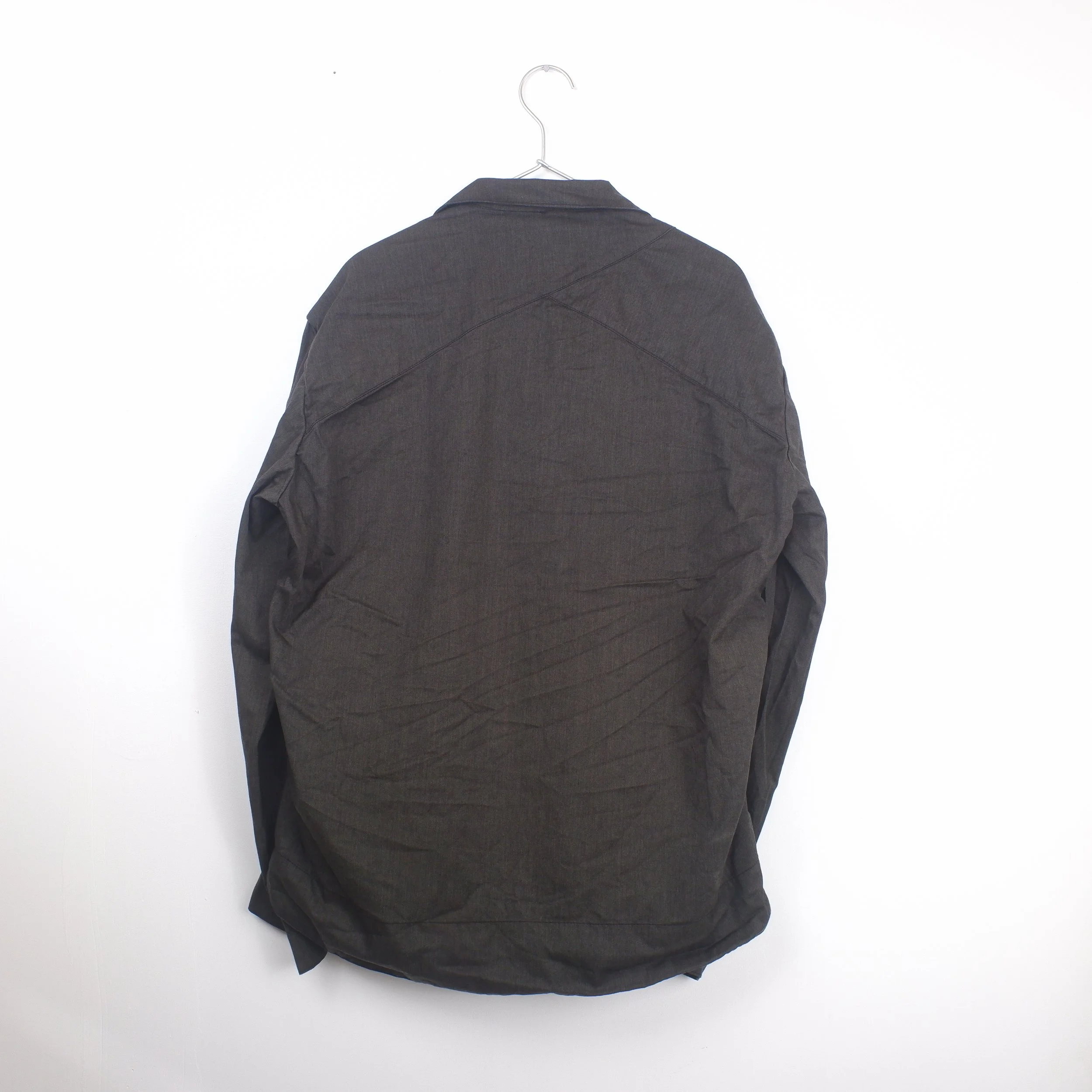 A Fancy Mesh Pocket overshirt inspired by an East German cellular cotton resort shirt vintage find. The body of the shirt is cut from Majocchi polyester-cotton high tension gabardine, panelled with raw organic cotton open cell mesh panels overlapping to form hand pockets