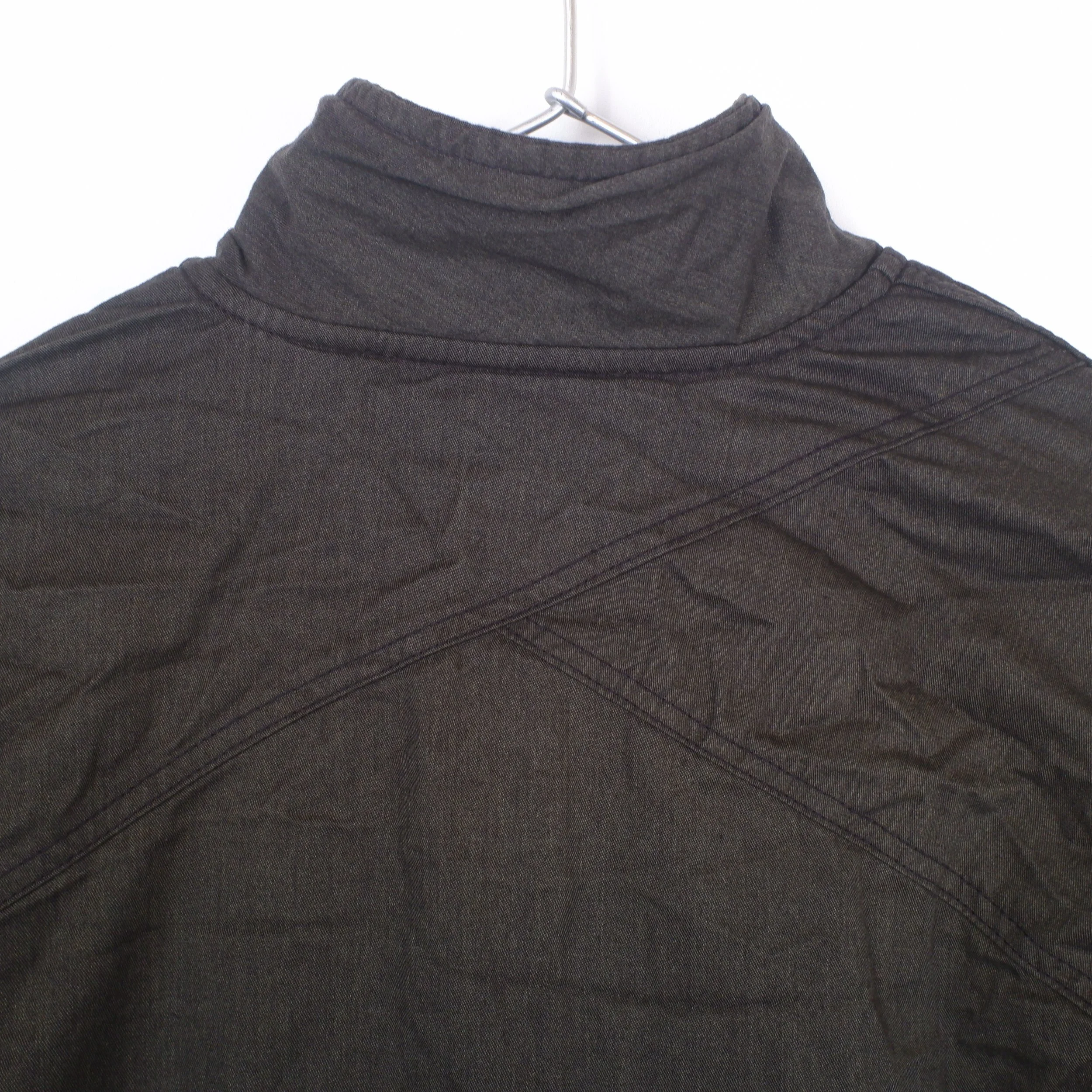 Sandwich construction of three fabrics- Majocchi polyester-cotton high tension gabardine, raw organic cotton open cell mesh, and peach finished cotton oxford. Sandwich creates quilted texture of a down jacket without the thickness or heat. The cotton mesh middle layer shrinks in dyeing, pulling in the other fabrics, but will gently stretch out with wear, for a personal fit.
