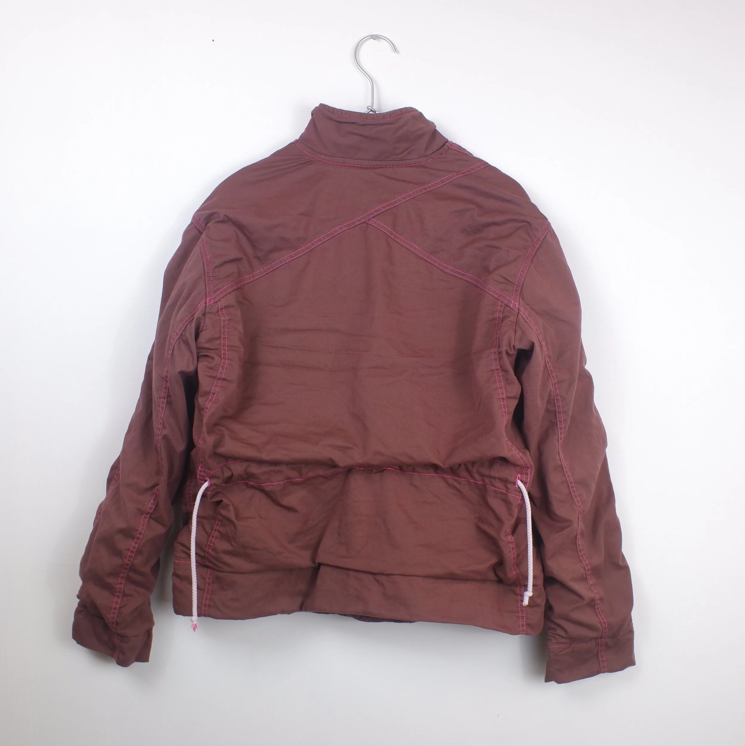 Sandwich construction of three fabrics- Majocchi polyester-cotton high tension gabardine, raw organic cotton open cell mesh, and peach finished cotton oxford. Sandwich creates quilted texture of a down jacket without the thickness or heat. The cotton mesh middle layer shrinks in dyeing, pulling in the other fabrics, but will gently stretch out with wear, for a personal fit.