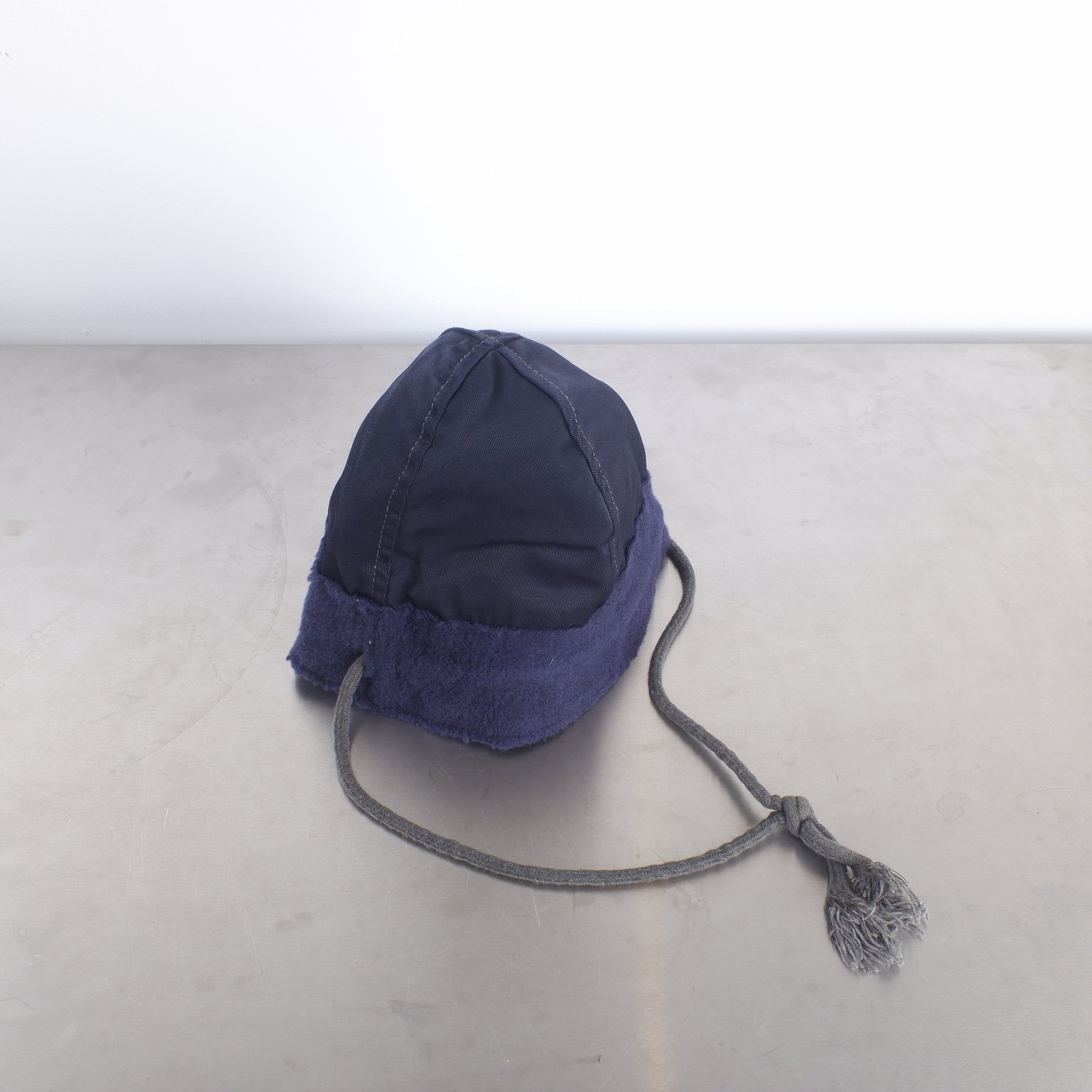 The applied panel creates the warmth of three layers in the hat without adding bulk to the seams. The wool panels edges are left raw and fray out over the nylon panels, showing the construction and fabric textures.